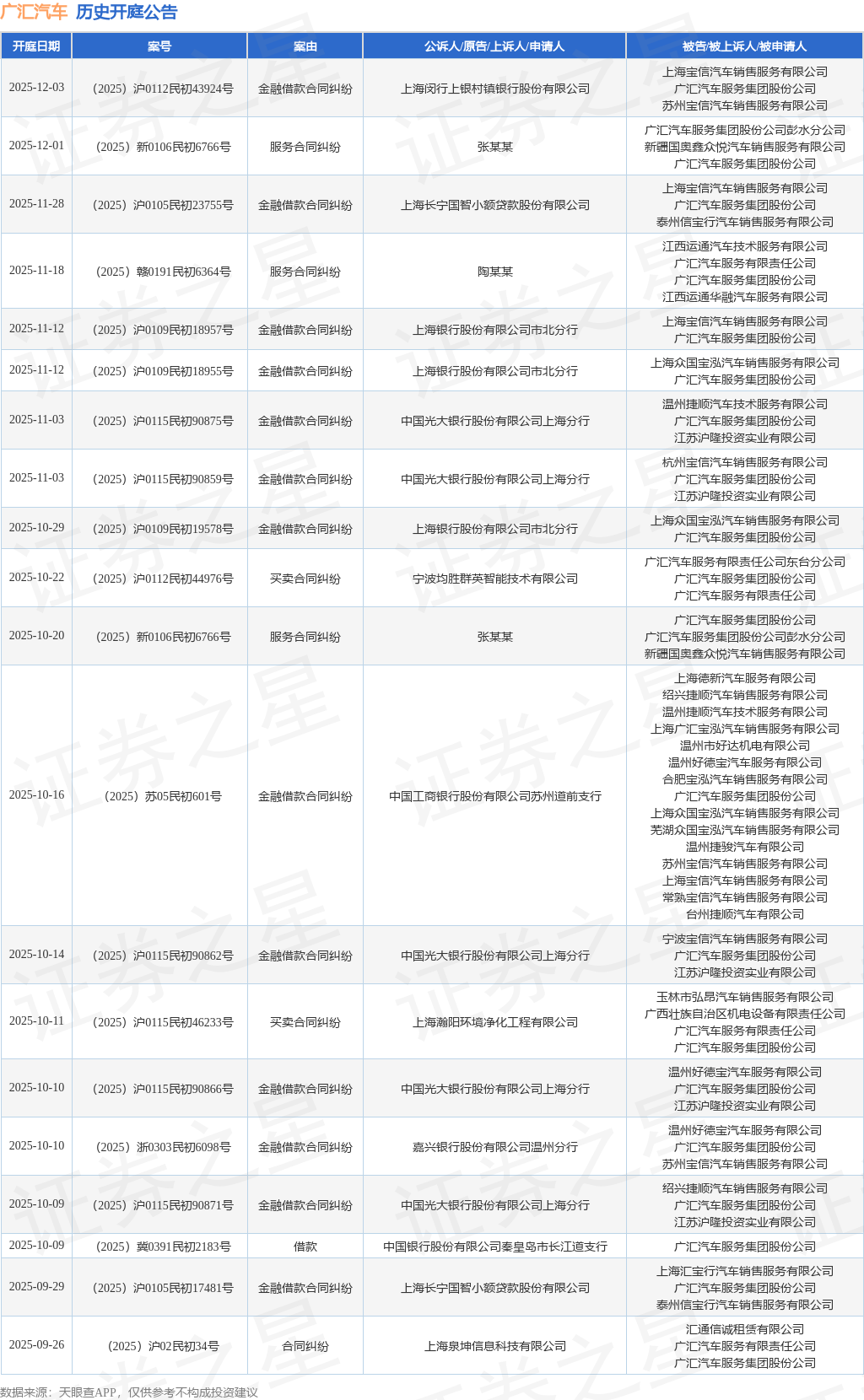 案号:(2025)沪0109民初19578号根据统计,近一年内以广汇汽车服务集团股份公司为当事人的历史开庭公告有109则,其中案由为“金融借款合同纠纷”的公告以38则居首,其次为“买卖合同纠纷”有37则,“服务合同纠纷”有14则。历史开庭公告(前20条)如下: