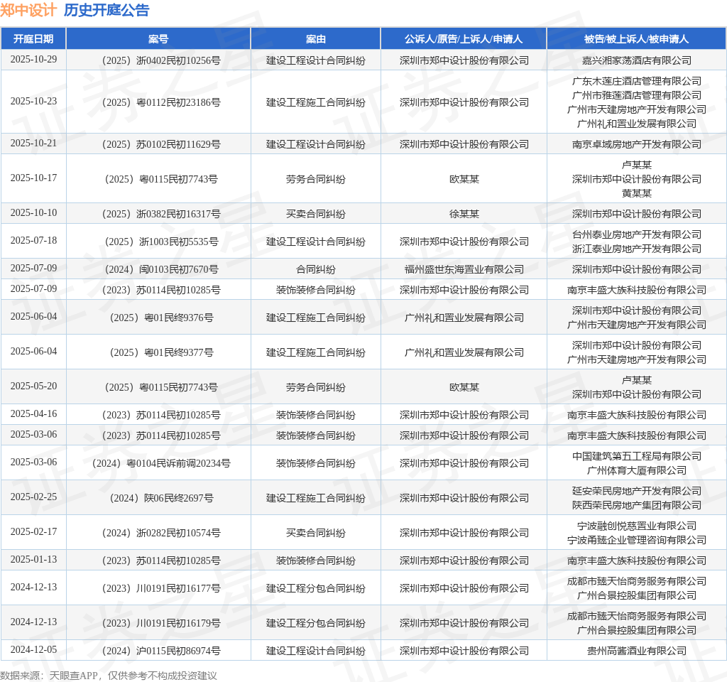 案号:(2025)浙0402民初10256号根据统计,近一年内以深圳市郑中设计股份有限公司为当事人的历史开庭公告有26则,其中案由为“装饰装修合同纠纷”的公告以6则居首,其次为“建设工程分包合同纠纷”有4则,“建设工程施工合同纠纷”有4则。历史开庭公告(前20条)如下: