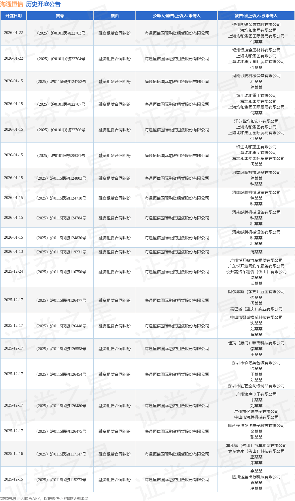 案号:(2025)沪0101民初27424号根据统计,近一年内以海通恒信国际融资租赁股份有限公司为当事人的历史开庭公告有1336则,其中案由为“融资租赁合同纠纷”的公告以1204则居首,其次为“申请实现担保物权”有54则,“合同纠纷”有18则。历史开庭公告(前20条)如下:
