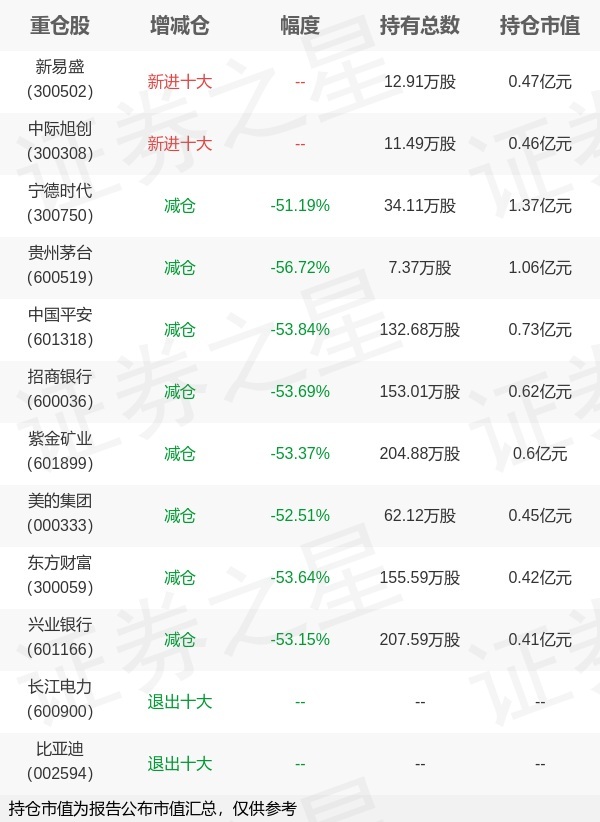 证券之星消息,10月27日银华基金旗下马君 谭跃峰管理的银华中证A500交易型开放式指数基金公布三季报,近1年净值增长率23.39%。与上一季度相比,该基金前十大重仓股新增新易盛,中际旭创;其中宁德时代持仓占比3.91%,为该基金第一大重仓股;长江电力,比亚迪等退出前十大重仓股;详细数据如下: