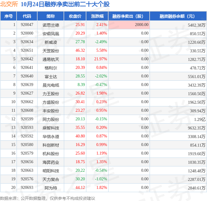 北交所融券净卖出前三分别为:诺思兰德(920047)融券净卖出2000股,前20具体见下表: