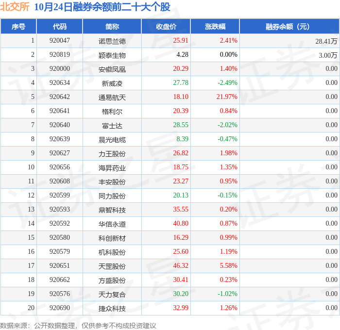 北交所融券余额前三分别为:诺思兰德(920047)融券余额28.41万元、颖泰生物(920819)融券余额3万元,前20具体见下表:
