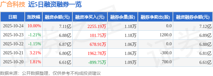 广合科技融资融券信息显示,融资方面,当日融资买入1.17亿元,融资偿还9418.52万元,融资净买入2255.19万元,连续3日净买入累计3035.85万元。融券方面,融券卖出1700.0股,融券偿还1700.0股,融券余量1.18万股,融券余额92.52万元。融资融券余额7.12亿元。