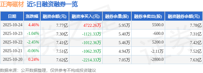 正海磁材融资融券信息显示,融资方面,当日融资买入1.04亿元,融资偿还5640.86万元,融资净买入4722.26万元。融券方面,融券卖出6100.0股,融券偿还600.0股,融券余量5.95万股,融券余额100.38万元。融资融券余额7.78亿元。