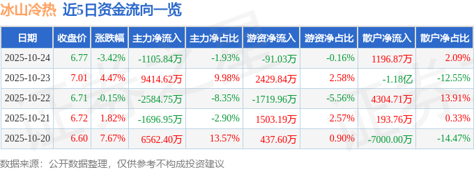 证券之星消息,截至2025年10月24日收盘,冰山冷热(000530)报收于6.77元,下跌3.42%,换手率14.18%,成交量85.11万手,成交额5.74亿元。