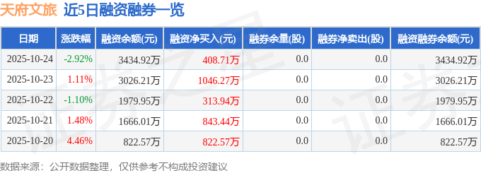 天府文旅融资融券信息显示,融资方面,当日融资买入1936.75万元,融资偿还1528.04万元,融资净买入408.71万元,连续3日净买入累计1768.91万元。融券方面,融券卖出0.0股,融券偿还0.0股,融券余量0.0股,融券余额0.0万元。融资融券余额3434.92万元。