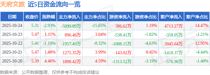 证券之星消息,截至2025年10月24日收盘,天府文旅(000558)报收于5.31元,下跌2.93%,换手率4.72%,成交量60.85万手,成交额3.26亿元。