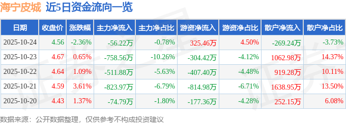 证券之星消息,截至2025年10月24日收盘,海宁皮城(002344)报收于4.56元,下跌2.36%,换手率1.23%,成交量15.71万手,成交额7226.27万元。