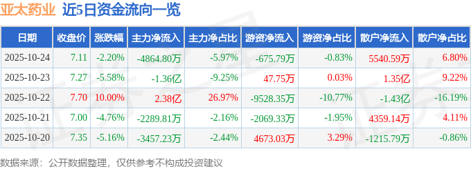 证券之星消息,截至2025年10月24日收盘,亚太药业(002370)报收于7.11元,下跌2.2%,换手率15.13%,成交量112.81万手,成交额8.14亿元。