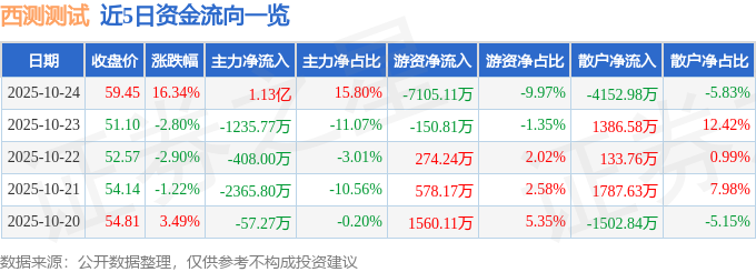 证券之星消息,截至2025年10月24日收盘,西测测试(301306)报收于59.45元,上涨16.34%,换手率20.57%,成交量11.99万手,成交额7.12亿元。