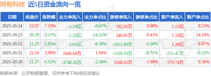 证券之星消息,截至2025年10月24日收盘,同有科技(300302)报收于22.07元,上涨7.19%,换手率16.44%,成交量60.64万手,成交额13.29亿元。