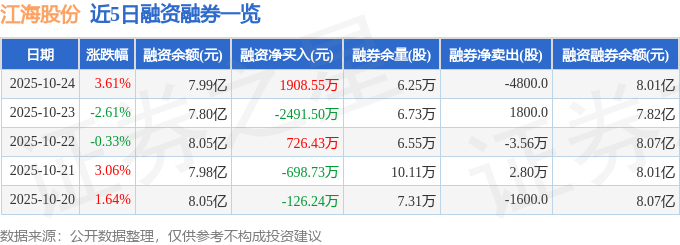 江海股份融资融券信息显示,融资方面,当日融资买入1.25亿元,融资偿还1.06亿元,融资净买入1908.55万元。融券方面,融券卖出1200.0股,融券偿还6000.0股,融券余量6.25万股,融券余额188.56万元。融资融券余额8.01亿元。
