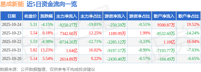 证券之星消息,截至2025年10月24日收盘,易成新能(300080)报收于5.31元,下跌4.15%,换手率4.86%,成交量90.99万手,成交额4.87亿元。