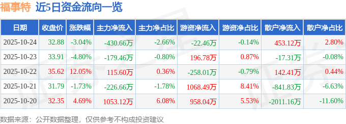 证券之星消息,截至2025年10月24日收盘,福事特(301446)报收于32.88元,下跌3.04%,换手率15.48%,成交量4.92万手,成交额1.62亿元。