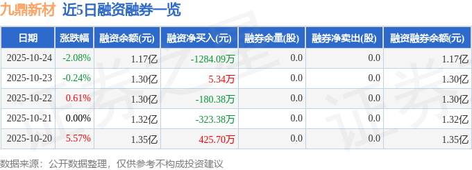 九鼎新材融资融券信息显示,融资方面,当日融资买入619.45万元,融资偿还1903.54万元,融资净偿还1284.09万元。融券方面,融券卖出0.0股,融券偿还0.0股,融券余量0.0股,融券余额0.0万元。融资融券余额1.17亿元。