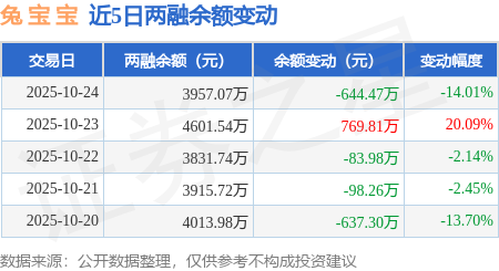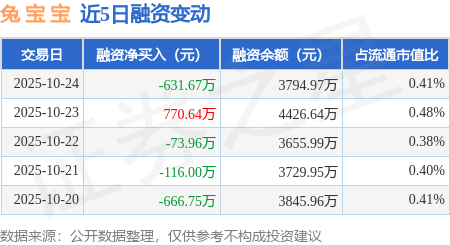 证券之星消息,10月24日,兔 宝 宝(002043)融资买入333.56万元,融资偿还965.23万元,融资净卖出631.67万元,融资余额3794.97万元。