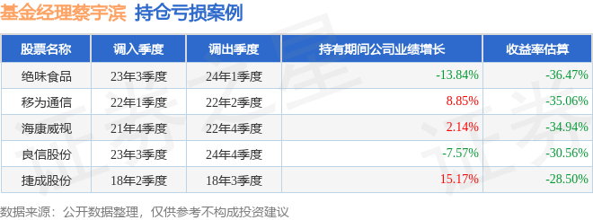 蔡宇滨管理的招商安益灵活配置混合A基金在23年3季度买入绝味食品,在持有2个季度后在24年1季度卖出。持有期间的估算收益率为-36.47%,持有期间绝味食品在2023年到2024年的年报营业总收入降幅为13.84%。