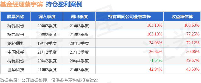 蔡宇滨管理的诺安低碳经济股票A基金在20年2季度买入桐昆股份,在持有1年又1个季度后在21年3季度卖出。持有期间的估算收益率为108.63%,持有期间桐昆股份在2020年到2021年的年报归属净利润增幅达163.1%。