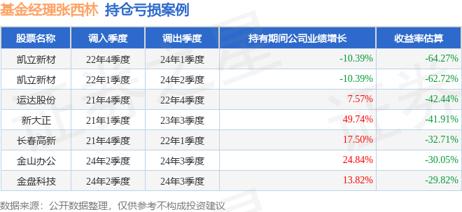 张西林管理的招商均衡成长混合A基金在22年4季度买入凯立新材,在持有1年又1个季度后在24年1季度卖出。持有期间的估算收益率为-64.27%,持有期间凯立新材在2022年到2024年的年报营业总收入降幅为10.39%。