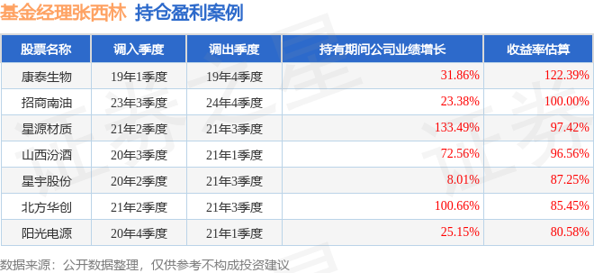 张西林管理的招商丰泰LOF基金在21年2季度买入星源材质,在持有1个季度后在21年3季度卖出。持有期间的估算收益率为97.42%,持有期间星源材质在2020年到2021年的年报归属净利润增幅达133.49%。