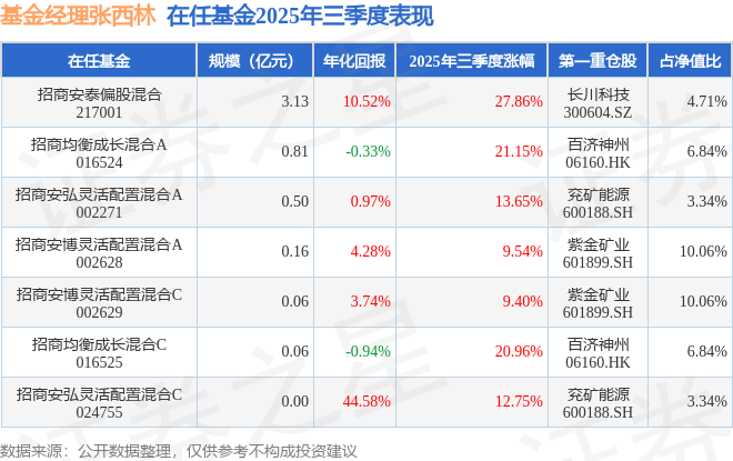 证券之星消息,截止2025年三季度末,基金经理张西林旗下共管理7只基金,本季度表现最佳的为招商安泰偏股混合(217001),季度净值涨27.86%。