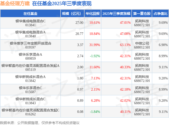 方建管理的银华智荟内在价值灵活配置混合发起A基金在23年4季度买入中际旭创,在持有1年又0个季度后在24年4季度卖出。持有期间的估算收益率为93.5%,持有期间中际旭创在2023年到2024年的年报归属净利润增幅达137.93%。