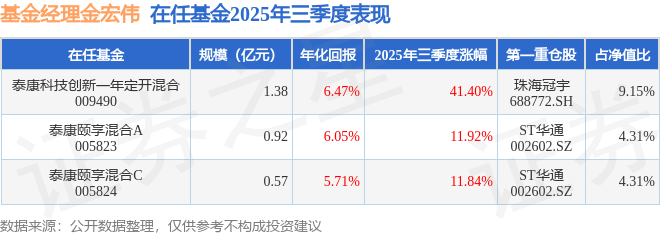 证券之星消息,截止2025年三季度末,基金经理金宏伟旗下共管理3只基金,本季度表现最佳的为泰康科技创新一年定开混合(009490),季度净值涨41.4%。