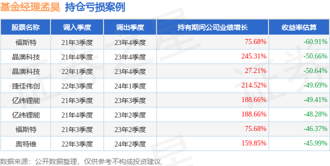 孟昊管理的鹏华品牌传承混合基金在21年3季度买入福斯特,在持有2年又1个季度后在23年4季度卖出。持有期间的估算收益率为-60.91%,持有期间福斯特在2021年到2023年的年报营业总收入增幅达75.68%。