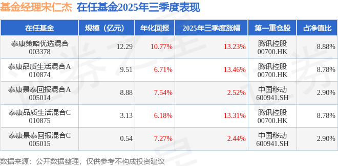 证券之星消息,截止2025年三季度末,基金经理宋仁杰旗下共管理5只基金,本季度表现最佳的为泰康品质生活混合A(010874),季度净值涨13.46%。