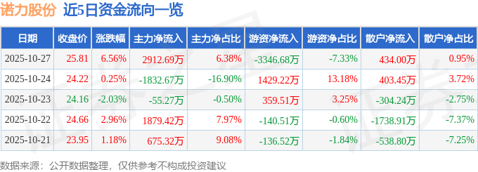 证券之星消息,截至2025年10月27日收盘,诺力股份(603611)报收于25.81元,上涨6.56%,换手率6.88%,成交量17.73万手,成交额4.57亿元。