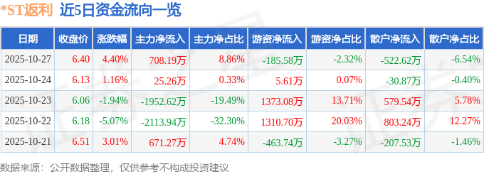 证券之星消息,截至2025年10月27日收盘,*ST返利(600228)报收于6.4元,上涨4.4%,换手率3.02%,成交量12.55万手,成交额7992.0万元。