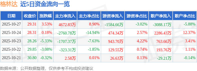 10月27日的资金流向数据方面,主力资金净流入4672.83万元,占总成交额8.9%,游资资金净流出1584.66万元,占总成交额3.02%,散户资金净流出3088.17万元,占总成交额5.88%。