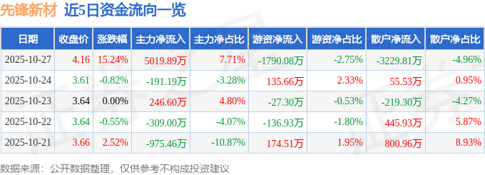 证券之星消息,截至2025年10月27日收盘,先锋新材(300163)报收于4.16元,上涨15.24%,换手率35.14%,成交量159.46万手,成交额6.51亿元。
