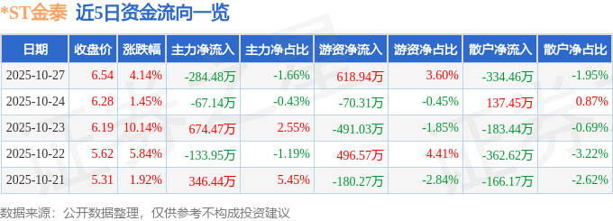 证券之星消息,截至2025年10月27日收盘,*ST金泰(300225)报收于6.54元,上涨4.14%,换手率5.51%,成交量26.2万手,成交额1.72亿元。