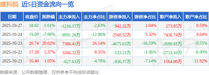 证券之星消息,截至2025年10月27日收盘,建科院(300675)报收于18.02元,下跌5.61%,换手率17.43%,成交量25.57万手,成交额4.62亿元。