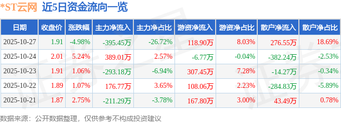 证券之星消息,截至2025年10月27日收盘,*ST云网(002306)报收于1.91元,下跌4.98%,换手率0.95%,成交量7.75万手,成交额1479.89万元。