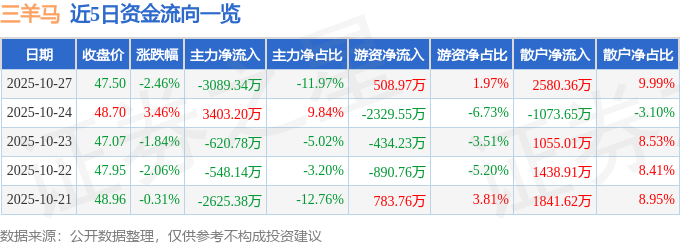证券之星消息,截至2025年10月27日收盘,三羊马(001317)报收于47.5元,下跌2.46%,换手率15.35%,成交量5.36万手,成交额2.58亿元。