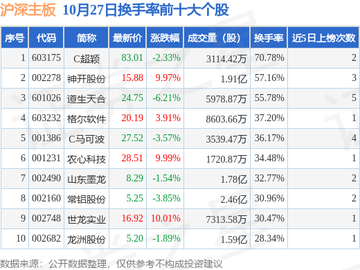 当日沪深主板换手率前10大个股中4只个股收涨,平均涨幅8.47%,其中C超颖(603175)以换手率70.78%排第一,6只个股近5个交易日中多次上榜。