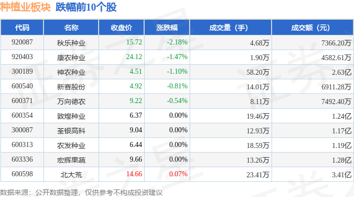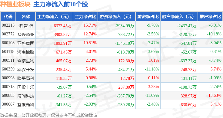 从资金流向上来看,当日种植业板块主力资金净流出1953.25万元,游资资金净流出3914.48万元,散户资金净流入5867.73万元。种植业板块个股资金流向见下表: