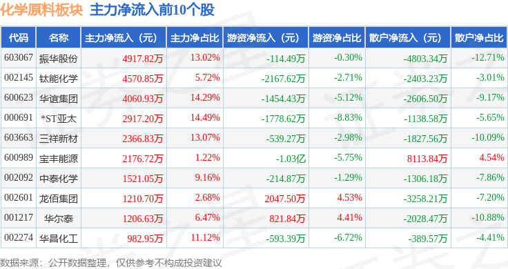 从资金流向上来看,当日化学原料板块主力资金净流出2.82亿元,游资资金净流出1432.78万元,散户资金净流入2.96亿元。化学原料板块个股资金流向见下表: