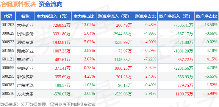 从资金流向上来看,当日冶钢原料板块主力资金净流入1.4亿元,游资资金净流出778.28万元,散户资金净流出1.32亿元。冶钢原料板块个股资金流向见下表:
