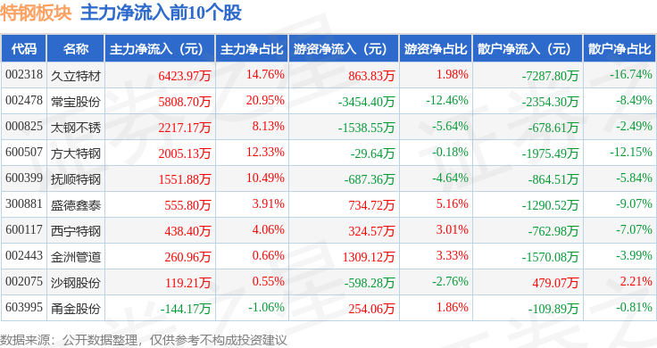 从资金流向上来看,当日特钢板块主力资金净流入1.56亿元,游资资金净流出4334.1万元,散户资金净流出1.12亿元。特钢板块个股资金流向见下表: