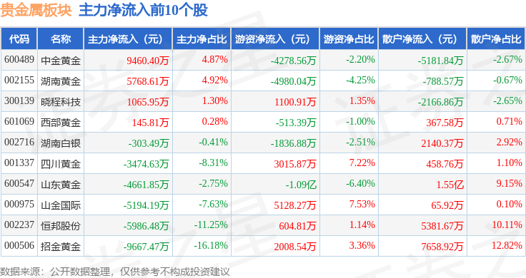 从资金流向上来看,当日贵金属板块主力资金净流出3.41亿元,游资资金净流出1.47亿元,散户资金净流入4.89亿元。贵金属板块个股资金流向见下表: