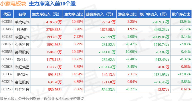 从资金流向上来看,当日小家电板块主力资金净流入1.24亿元,游资资金净流出655.0万元,散户资金净流出1.17亿元。小家电板块个股资金流向见下表: