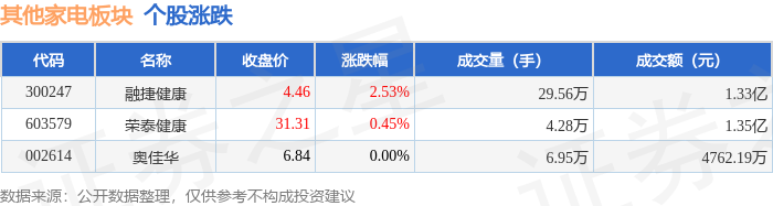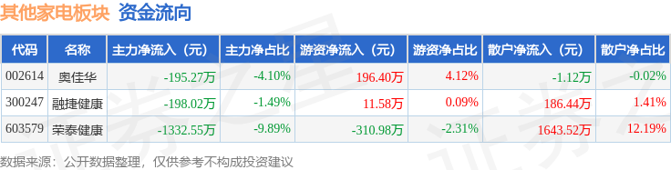 从资金流向上来看,当日其他家电板块主力资金净流出1725.85万元,游资资金净流出102.99万元,散户资金净流入1828.84万元。其他家电板块个股资金流向见下表: