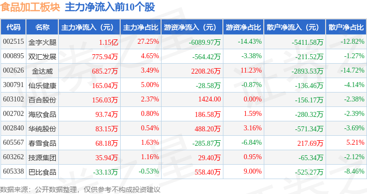 从资金流向上来看,当日食品加工板块主力资金净流出933.48万元,游资资金净流出3902.58万元,散户资金净流入4836.06万元。食品加工板块个股资金流向见下表: