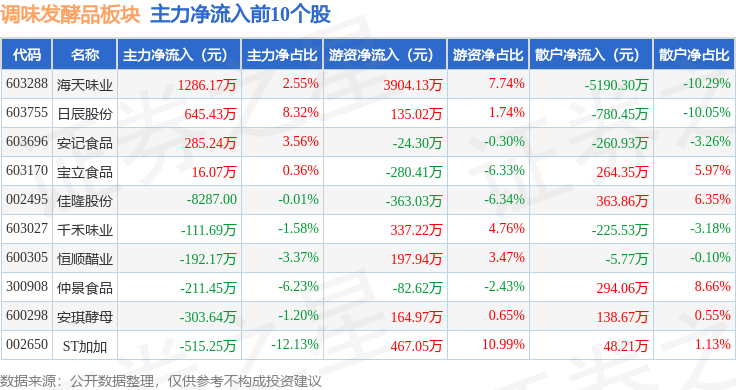 从资金流向上来看,当日调味发酵品板块主力资金净流出9373.39万元,游资资金净流入8338.37万元,散户资金净流入1035.02万元。调味发酵品板块个股资金流向见下表: