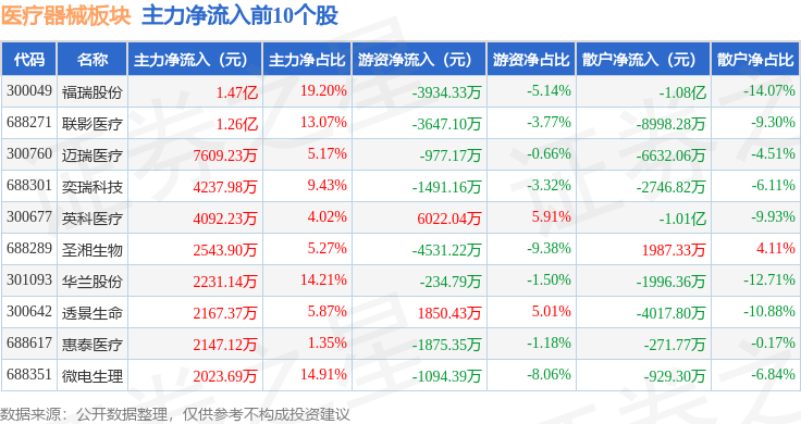 从资金流向上来看,当日医疗器械板块主力资金净流入7775.92万元,游资资金净流入8348.11万元,散户资金净流出1.61亿元。医疗器械板块个股资金流向见下表: