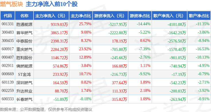 从资金流向上来看,当日燃气板块主力资金净流出3528.5万元,游资资金净流出8556.68万元,散户资金净流入1.21亿元。燃气板块个股资金流向见下表:
