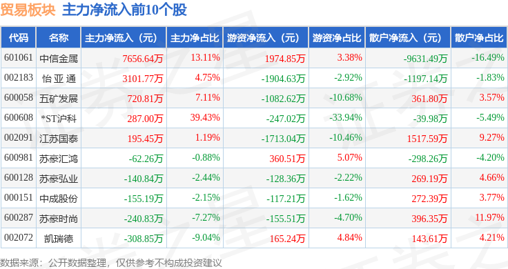 从资金流向上来看,当日贸易板块主力资金净流入8110.04万元,游资资金净流出2422.39万元,散户资金净流出5687.65万元。贸易板块个股资金流向见下表: